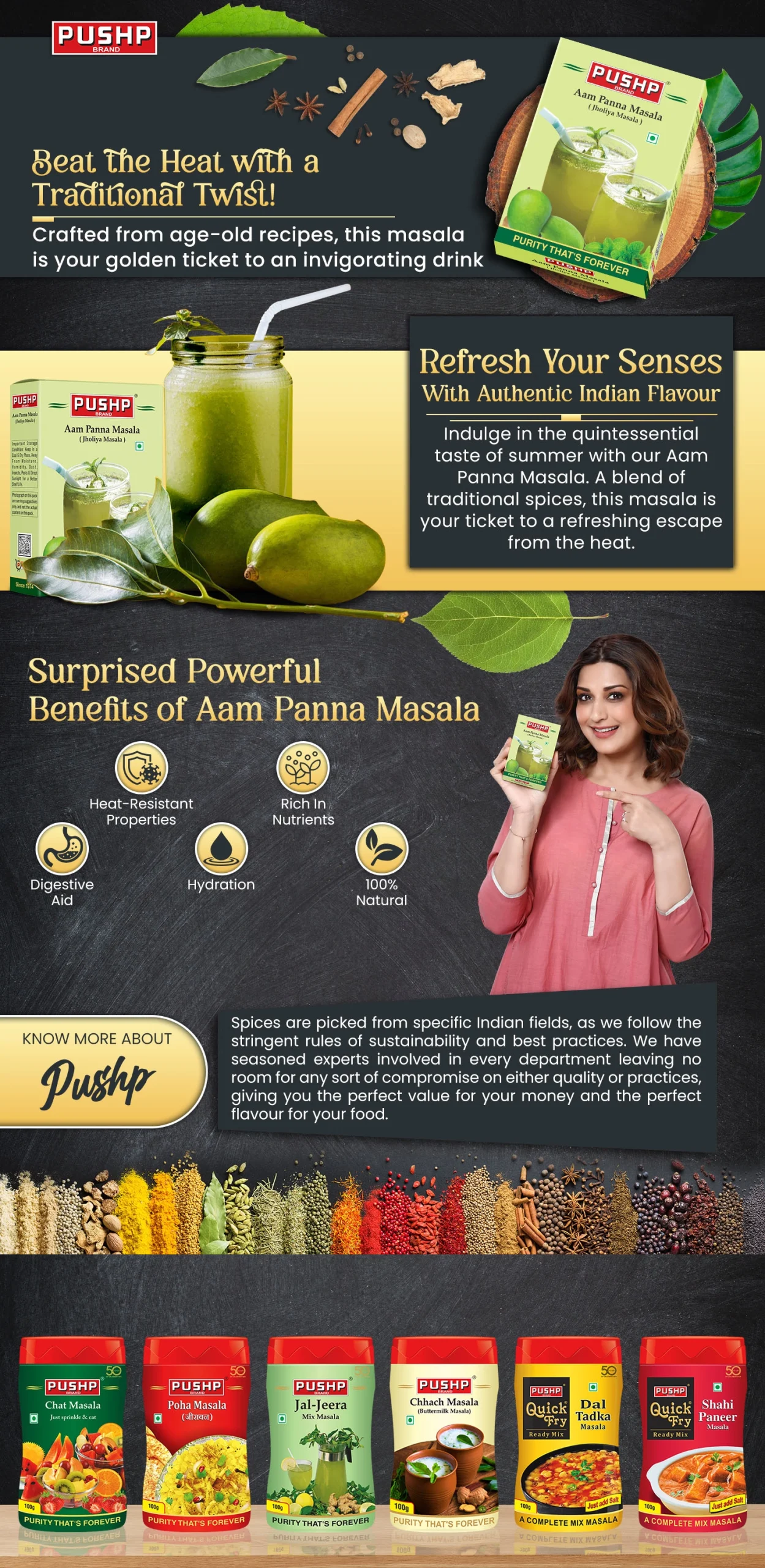 Pushp Aam Panna Masala is a traditional Indian mixed masala powder, perfect for making the refreshing aam panna (raw mango) drink. This low-spice powder is not a curry powder, but rather a carefully crafted blend of spices and seasonings.
